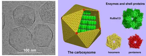 Les cyanobactéries possèdent des organites particuliers appelés carboxysomes qui concentrent le CO2 autour de la Rubisco afin d'en accroître le rendement. L'anhydrase carbonique présente dans ces carboxysomes libère le CO2 stocké dans le cytosol sous forme d'ions bicarbonate HCO3− concentrés dans la cellules de cyanobactérie par un transport actif à travers la membrane plasmique, qu'ils ne peuvent franchir dans l'autre sens en raison de leur charge électrique. Ces ions sont eux-mêmes formés à l'extérieur de la cellule à partir du CO2 dissous sous l'action d'autres anhydrases carboniques situées dans le milieu extracellulaire. Une fois dans le cytosol, les ions HCO3− ne libèrent que très lentement du CO2 sans l'action d'anhydrases carboniques, et diffusent donc vers les carboxysomes, où ils sont traités par des anhydrases carboniques avant d'être fixés par des molécules de Rubisco[28].