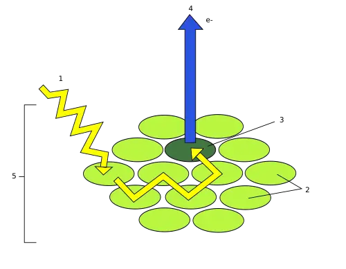 - Les autres molécules de chlorophylle a et b et les molécules de caroténoïdes forment une antenne collectrice qui absorbe les photons et transmettent l'énergie vers les centres réactionnels.