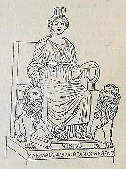 La « Grande Mère », Cybèle, comme la connaissent les Grecs et les Romains, est à l'origine vénérée dans les montagnes de Phrygie, où elle est connue sous le nom de « Mère de la Montagne ». Dans sa forme phrygienne typique, elle porte une longue robe ceinturée, un polos (une haute coiffe cylindrique) et un voile couvrant tout le corps. La version ultérieure de Cybèle a été établie par un élève de Phidias, le sculpteur Agoracritos, et est devenue l'image la plus largement adoptée par les fidèles de Cybèle, tant dans le monde égéen qu'à Rome. On la voit humanisée, mais toujours sur le trône, une main posée sur un lion et l'autre tenant le tympan, un tambour à cadre circulaire, semblable à un tambourin.