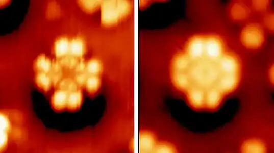 Microscopie à effet tunnel d'une molécule de phtalocyanine aux potentiels −2 et +1 V[9]. Noter que cette image restitue la densité électronique dans les orbitales HOMO et LUMO et non la forme des atomes.