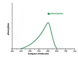 La phycocyanine absorbe les lumières orange et rouge, dans des longueurs d'onde plutôt proches de 620 nm (dépendant de son type spécifique), et émet de la fluorescence à environ 650 nm (dépendant aussi de son type). L'allophycocyanine absorbe et émet à des longueurs d'onde plus élevées que la phycocyanine C ou la phycocyanine R.