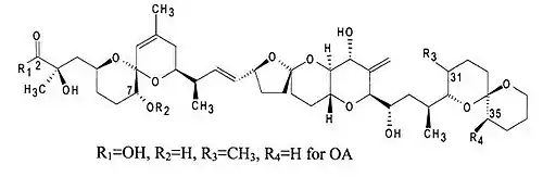 Les toxines diarrhéiques (en anglais DSP, Diarrheic Shellfish Poison) sont produites par les Dinoflagellés des genres Dinophysis et Prorocentrum, dont le type est l'acide okadaïque. Elles provoquent rapidement diarrhée et vomissements (en 30 minutes à 2 heures après l'ingestion de coquillages contaminés), rétrocédant spontanément en 2 à 3 jours, sans séquelles. On y associe les pectenotoxines hépatotoxiques, les yessotoxines sans toxicité avérée et les azaspiracides diarrhéiques. Les normes retenues sont de 160 µg/kg pour l'acide okadaïque et les azaspiracides, et 1 mg/kg pour les pectenotoxines. On utilise préférentiellement un test biologique sur souris.