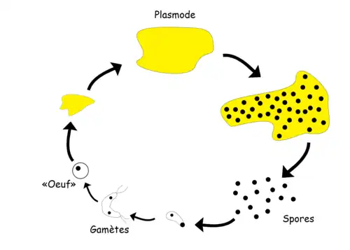 Quand les réserves alimentaires sont épuisées, le plasmode entre en phase de reproduction pour former des sporocystes. Des sporocystes se forment dans le plasmode, la méiose se produit au sein de ces structures et les spores se forment. Les sporocystes se forment habituellement à l'air libre pour que les spores soient dispersées par le vent. Les spores peuvent rester viables pendant des années. Toutefois, lorsque les conditions environnementales sont favorables à la croissance, les spores germent et libèrent des cellules soit flagellées, soit amiboïdes (stade mobiles). Les cellules fusionnent ensuite pour former un nouveau plasmode.
