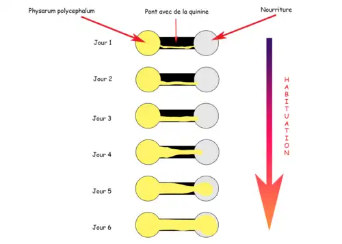 En générant de façon répétée des stimuli de chaud et de froid à Physarum polycephalum, et ce avec 60 minutes d'intervalle, des biophysiciens de l'université de Hokkaidō découvrent que le plasmode peut anticiper ces stimuli en y réagissant même quand ceux-ci sont absents. Ils montrent également que ces résultats peuvent être obtenus en appliquant les stimuli avec un intervalle de 30 ou 90 minutes[22].