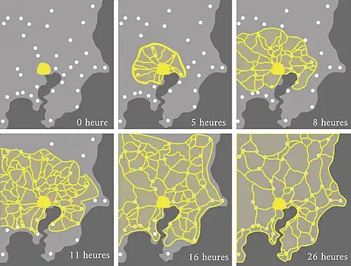 - ↑ (en) Atsushi Tero, Seiji Takagi, Tetsu Saigusa, Kentaro Ito, Dan P. Bebber, Mark D. Fricker, Kenji Yumiki, Ryo Kobayashi et Toshiyuki Nakagaki, « Rules for biologically inspired adaptive network design », Science, vol. 327, no 5964, , p. 439-442 (lire en ligne, consulté le ).