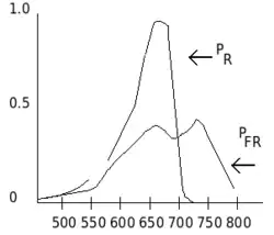- Pfr (pour far red) : la forme active, dont le pic d'absorption se situe à 730 nm (rouge lointain).