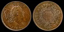 - ↑ (en-US) CoinWeek, « Half Cents - Liberty Cap Half Cent, Head Facing Right, Small Head, 1795-1797 », sur CoinWeek, (consulté le )