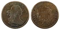 - ↑ (en-US) « Draped Bust Half Cents (1800-1808) | Complete Coin Guide » (consulté le )