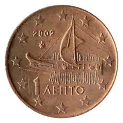 Une trière, datant du Ve siècle, témoin du patrimoine maritime grec (thème choisi pour les pièces de 1, 2 et 5 cent(ime)s)[17]. En bas est indiquée la valeur nominale en grec, 1 ΛΕΠΤΟ. En haut, à gauche est indiqué le millésime. Le tout est entouré des 12 étoiles du drapeau européen. | |