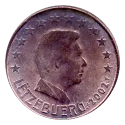 L'effigie d'Henri (1955- ), Grand-Duc de Luxembourg, tournée vers la droite. Le tout est entouré de la mention du pays émetteur LËTZEBUERG, du millésime et des 12 étoiles du drapeau européen. | |