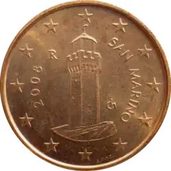 La tour du pic Montale du mont Titano, à Saint-Marin, considérée comme la « troisième tour ». À droite, en arc de cercle, la mention du pays émetteur SAN MARINO et, à gauche, le millésime. Le tout est entouré des 12 étoiles du drapeau européen. | |