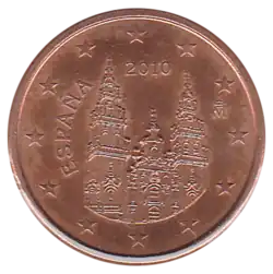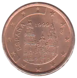 Une vue d'une partie la façade Obradoiro de la Cathédrale de Saint-Jacques-de-Compostelle, en Galice. À gauche, en arc de cercle, la mention du pays émetteur ESPAÑA. Entre les 2 tours de la cathédrale, le millésime. Le tout est entouré des 12 étoiles du drapeau européen dont 5 sont en creux et 7 en relief. | |