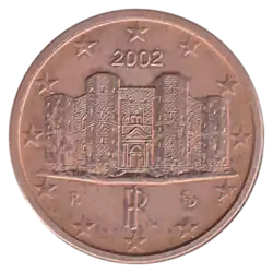 Le château Castel del Monte, à Andria. En bas, la mention du pays émetteur représenté par les lettres R et I (pour Repubblica italiana) superposées. En haut, le millésime. Le tout est entouré des 12 étoiles du drapeau européen. | |
