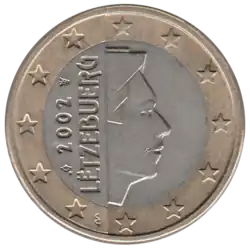 L'effigie stylisée d'Henri (1955- ), Grand-Duc de Luxembourg, tournée vers la droite et dont la partie arrière est cachée par le millésime et la mention du pays émetteur LËTZEBUERG. Le tout des douze étoiles du drapeau européen, dont cinq sont en creux. | |