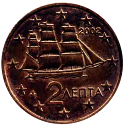 Une corvette, telle qu'utilisée pendant la Guerre d'indépendance grecque, témoin du patrimoine maritime grec (thème choisi pour les pièces de 1, 2 et 5 cent(ime)s)[17]. En bas est indiquée la valeur nominale en grec, 2 ΛΕΠΤΑ. En haut, à droite est indiqué le millésime. Le tout est entouré des douze étoiles du drapeau européen. | |