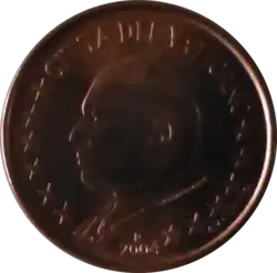 L'effigie du pape Jean-Paul II (1920-2005), portant une calotte, tournée vers la gauche. Le tout est entouré de la mention du pays émetteur CITTÀ DEL VATICANO, en haut, des douze étoiles du drapeau européen et du millésime, en bas. | |