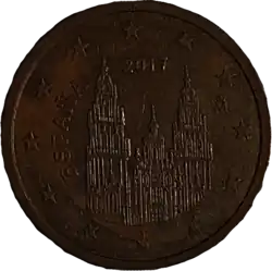 Une vue d'une partie la façade Obradoiro de la cathédrale de Saint-Jacques-de-Compostelle, en Galice. À gauche, en arc de cercle, la mention du pays émetteur ESPAÑA. Entre les 2 tours de la cathédrale, le millésime. Le tout est entouré des douze étoiles du drapeau européen dont 5 sont en creux et 7 en relief. | |