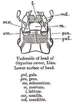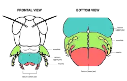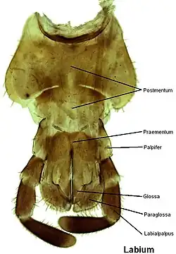 - ↑ Le labium des insectes ayant des pièces buccales primitives est en général composé de trois sclérites : le submentum (appelé aussi postmentum, ou postlabium s'il est divisé), pièce proximale ; le mentum ; le prémentum (ou prélabium), pièce distale qui résulte de la fusion des deux stipes maxillaires, porte un petit segment appelé palpiger d'où partent deux palpes labiaux, et se termine par une paire de lobes internes (appelés glosses ou galeae) et de lobes externes (appelés paraglosses ou laciniae).