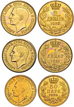 Pièce n°1 (avers) : 1 dinar de 1925, à l'effigie de Alexandre 1er, roi des Serbes, Croates et Slovènes.