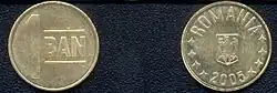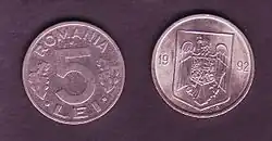- ↑ la pièce de 1 leu 1992 porte l'insigne de la Banca Națională a României (Banque Nationale de Roumanie)