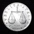 | Avers : L'inscription « repvbblica italiana » et une balance | Revers : Corne d'abondance avec à gauche valeur faciale, l'année et la marque d'atelier | ||||