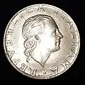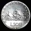| Avers : Buste de femme entouré de 19 blasons de villes et régions | Revers : L'inscription « repvbblica italiana » et trois caravelles | ||||