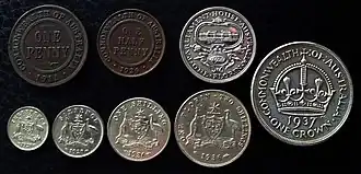 Cependant, avec l'adoption d'un gouvernement fédéral en Australie, les pièces britanniques ont continué à être utilisées jusqu'en 1910, date à laquelle les premières pièces d'argent australiennes ont été introduites. Ces nouvelles pièces, qui comprenaient des florins, des shillings, des six pence et des trois pence, étaient toutes frappées d'un portrait du roi d'Angleterre Édouard VII. Un an plus tard, les centimes et demi-centimes australiens entrent en circulation. Contrairement à la Nouvelle-Zélande, il n'y a pas de demi-couronne. En 1931, la monnaie souveraine en or cesse d’être frappée en Australie. Les couronnes, soient des pièces de cinq shillings, sont frappées en 1937 et 1938.