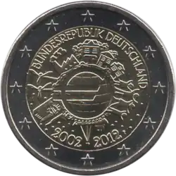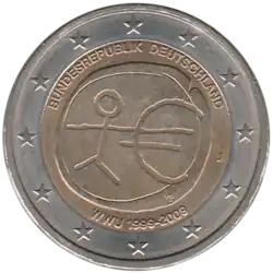 Tous les pays de la zone euro ont émis le 1er janvier une pièce commémorative de 2 € pour célébrer le 10e anniversaire de l'Union économique et monétaire. Le centre de la pièce illustre une silhouette humaine stylisée dont le bras gauche est prolongé par le symbole de l'euro. Le nom du pays émetteur BUNDESREPUBLIK DEUTSCHLAND apparaît dans la partie supérieure, tandis que l'indication 1999-2009 et l'acronyme WWU (pour Wirtschafts- und Währungsunion, Union économique et monétaire ou UEM) apparaissent dans la partie inférieure. L'anneau externe de la pièce représente les douze étoiles du drapeau européen. | ||||||