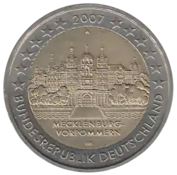 La représentation du Château de Schwerin. Les mots MECKLENBURG-VORPOMMERN (Mecklembourg-Poméranie-Occidentale) apparaissent sous le château. Les douze étoiles du drapeau européen forment un demi-cercle sur la partie supérieure de l'anneau externe, interrompu par le millésime 2007 au sommet de la pièce. Le nom du pays émetteur BUNDESREPUBLIK DEUTSCHLAND forme un demi-cercle sur la partie inférieure de l'anneau extérieur. | ||||||