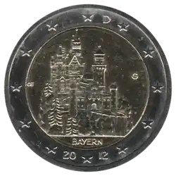 La représentation du château de Neuschwanstein, près de Füssen, vu de l'est, avec le portail en avant-plan, surmonté des tours et tourelles de style médiéval. Derrière le château, une vue stylisée du panorama montagneux. L'anneau externe de la pièce comporte les douze étoiles du drapeau européen. Entre les étoiles se trouvent, dans la partie inférieure, le millésime 2012 et, dans la partie supérieure, l'indication du pays émetteur D (pour Deutschland). | ||||||