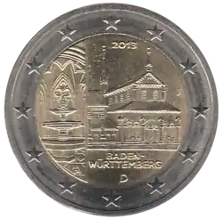 La représentation de l'Abbaye de Maulbronn, avec sur la partie droite une vue de la façade du bâtiment et sur la gauche le détail de la fontaine. En haut, le millésime 2013. En bas l'inscription BADEN-WÜRTTEMBERG (Bade-Wurtemberg) et la mention du pays émetteur D (pour Deutschland). L'anneau externe de la pièce comporte les douze étoiles du drapeau européen. | ||||||
