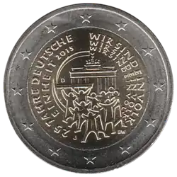 Un groupe de personnes stylisées devant la Porte de Brandebourg, à Berlin, entourés, à gauche, de la légende 25 JAHRE DEUTSCHE EINHEIT (25 ans de l'unité allemande) et le millésime 2015 et, à droite, de la légende WIR SIND EIN VOLK (Nous sommes un seul peuple) répétée trois fois. L'initiale du pays émetteur D (pour Deutschland) est repris à gauche de la Porte de Brandebourg. L'anneau externe de la pièce comporte les douze étoiles du drapeau européen. | ||||||