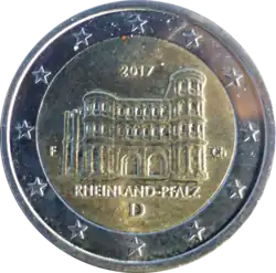La représentation de la Porta Nigra à Trèves, côté campagne. En bas, la légende RHEINLAND-PFALZ (Rhénanie-Palatinat) au-dessus de l'initiale du pays émetteur D (pour Deutschland). En haut, le millésime 2017. L'anneau externe de la pièce comporte les douze étoiles du drapeau européen. | ||||||