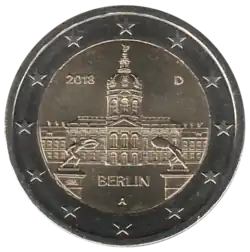La représentation du bâtiment principal du Château de Charlottenbourg, à Berlin, et de sa cour d'honneur. À l'avant-plan, le haut des deux piliers du portail d'entrée du château, surmontés chacun par la statue d'un gladiateur. Entre les piliers, la légende BERLIN au-dessus de l'initiale du pays émetteur D (pour Deutschland). En haut, à gauche, le millésime 2018. L'anneau externe de la pièce comporte les douze étoiles du drapeau européen. | ||||||