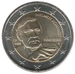 - ↑ (de) « 2-Euro-Gedenkmünze "100. Geburtstag Helmut Schmidt" », sur site du Ministère fédéral des Finances allemand, (consulté le ).