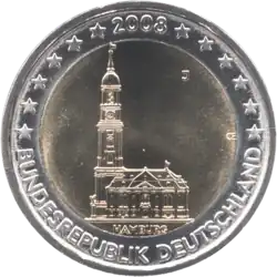 La représentation de l'Église Saint-Michel de Hambourg. Le mot HAMBURG (Hambourg) apparaît sous l'église. Les douze étoiles du drapeau européen forment un demi-cercle sur la partie supérieure de l'anneau externe, interrompu par le millésime 2008 au sommet de la pièce. Le nom du pays émetteur BUNDESREPUBLIK DEUTSCHLAND forme un demi-cercle sur la partie inférieure de l'anneau extérieur. | ||||||
