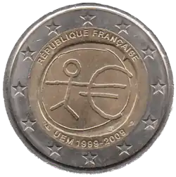Tous les pays de la zone euro ont émis le 1er janvier une pièce commémorative de 2 € pour célébrer le 10e anniversaire de l'Union économique et monétaire. Le centre de la pièce illustre une silhouette humaine stylisée dont le bras gauche est prolongé par le symbole de l'euro. Le nom du pays émetteur RÉPUBLIQUE FRANÇAISE apparaît dans la partie supérieure, tandis que l'indication 1999-2009 et l'acronyme UEM (pour Union économique et monétaire) apparaissent dans la partie inférieure. L'anneau externe de la pièce représente les douze étoiles du drapeau européen. | ||||||