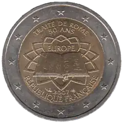 Tous les pays de la zone euro, dont la France, ont émis le 25 mars 2007 une pièce commémorative de 2 € pour célébrer le 50e anniversaire du traité de Rome. Le centre de la pièce représente le traité signé par les six États membres fondateurs devant un arrière-plan évoquant le dallage, dessiné par Michel-Ange, de la place du Capitole, à Rome, où le traité a été signé le 25 mars 1957. Le mot EUROPE figure au-dessus du livre. La légende TRAITÉ DE ROME et 50 ANS est inscrite au-dessus du dessin. Le millésime 2007 et le nom du pays émetteur RÉPUBLIQUE FRANÇAISE sont inscrits sous le dessin. L'anneau externe de la pièce comporte les douze étoiles du drapeau européen. | ||||||