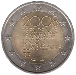 La légende 2008 PRÉSIDENCE FRANÇAISE UNION EUROPÉENNE et l'acronyme du pays émetteur RF (pour République française). L'anneau externe de la pièce comporte les douze étoiles du drapeau européen.