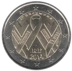 Le ruban rouge symbolisant la lutte contre SIDA (colorisé sur les pièces en qualité Brillant universel et Belle Épreuve) entouré de deux autres rubans placés à l'envers et formant chacun un V pour victoire (sur la maladie). Sur le ruban de gauche, les mots JOURNÉE MONDIALE. Sur le ruban de droite, les mots CONTRE LE SIDA. En haut, la date de la Journée mondiale contre le SIDA, 1er DÉCEMBRE. En bas, les initiales du pays émetteur RF (pour République française) et le millésime 2014. L'anneau externe de la pièce comporte les douze étoiles du drapeau européen. | ||||||