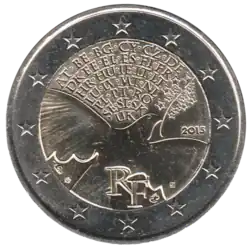 La représentation d'une colombe de la paix apportant un rameau d'olivier dont les feuilles ont été remplacées par les 12 étoiles du drapeau européen. Au-dessus d'elle sont placés, sur six lignes, les codes pays selon le code de rédaction institutionnel de l'Union européenne[26] des 28 pays de l'Union européenne, séparés par un point : AT•BE•BG•CY•CZ•DE / DK•EE•EL•ES•FI•FR / HR•HU•IE•IT•LT / LU•LV•MT•NL / PL•PT•RO / SE•SI•SK / UK (dans l'ordre pour l'Autriche, la Belgique, la Bulgarie, Chypre, la République tchèque, l'Allemagne, le Danemark, l'Estonie, La Grèce, l'Espagne, la Finlande, la France, la Croatie, la Hongrie, l'Irlande, l'Italie, la Lituanie, le Luxembourg, la Lettonie, Malte, les Pays-Bas, la Pologne, le Portugal, la Roumanie, la Suède, la Slovénie, la Slovaquie et le Royaume-Uni). Le millésime 2015 est placé au-dessus de l'aile gauche. En bas, l'abréviation du pays émetteur RF (pour République française). L'anneau externe de la pièce comporte les douze étoiles du drapeau européen. | ||||||