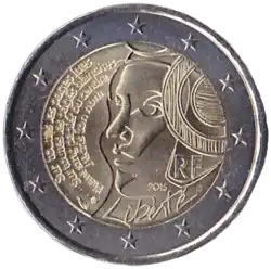 L'effigie stylisée et en gros plan de Marianne, allégorie de la République française, tournée vers la gauche et portant le bonnet phrygien sur lequel est placée une cocarde tricolore (colorisée dans ses versions Brillant universel et Belle Épreuve). À gauche sont placés verticalement quatre vers du poème de Paul Éluard Liberté, écrit en 1942 : Sur toutes les pages lues / Sur toutes les pages blanches / Pierre sang papier ou cendre / J'écris ton nom. Sous le menton de Marianne est repris, en lettres manuscrites, le titre du poème qui est également valeur de la démocratie : Liberté, au-dessus duquel est indiqué le millésime 2015. Sous la cocarde, l'abréviation du pays émetteur RF (pour République française). L'anneau externe de la pièce comporte les douze étoiles du drapeau européen. | ||||||