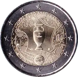 - ↑ A.M., Explications sur l'arrière-plan des 2, 10 et 100 € « Euro 2016 ». In : Numismatique & Change, n° 475, mars 2016, p. 12.
