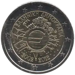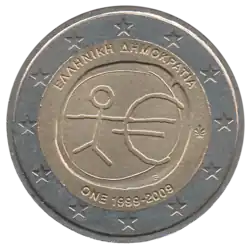 Tous les pays de la zone euro ont émis le 1er janvier une pièce commémorative de 2  pour célébrer le 10e anniversaire de l'Union économique et monétaire. Le centre de la pièce illustre une silhouette humaine stylisée dont le bras gauche est prolongé par le symbole de l'euro. Le nom du pays émetteur ΕΛΛΗΝΙΚΗ ΔΗΜΟΚΡΑΤΙΑ apparaît dans la partie supérieure, tandis que l'indication 1999-2009 et l'acronyme ONE (pour Οικονομική και Νομισματική Ένωση, Union économique et monétaire ou UEM) apparaissent dans la partie inférieure. L'anneau externe de la pièce représente les douze étoiles du drapeau européen.