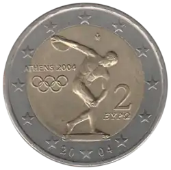 Le dessin d'une statue antique représentant un discobole sur le point de lancer le disque. Les cinq anneaux olympiques, au-dessus desquels on peut lire la légende en anglais ATHENS 2004 (Athènes 2004), sont représentés à gauche, tandis que le chiffre 2 et le mot ΕΥΡΩ (euro) se trouvent à droite. L'anneau externe de la pièce comporte les douze étoiles du drapeau européen, ainsi que le millésime entrecoupé par l'étoile la plus basse, de la manière suivante : 20*04.
