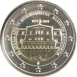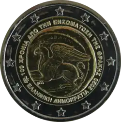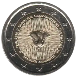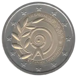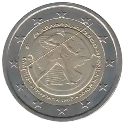 La Grèce a été le premier pays à émettre une pièce commémorative de 2 €, en 2004, à l'occasion de Jeux olympiques d'Athènes[7].