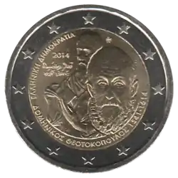 Portrait de Saint Paul d'après La Greco et autoportrait présumé du Greco. En dessous, son nom ΔΟΜΗΝΙΚΟΣ ΘΕΟΤΟΚΟΠΟΥΛΟΣ (Domínikos Theotokópoulos) et ses années de naissance et de mort 1541-1614. En haut, à gauche, le nom du pays émetteur ΕΛΛΗΝΙΚΗ ΔΗΜΟΚΡΑΤΙΑ, le millésime et la signature d'El Greco. L'anneau externe de la pièce comporte les douze étoiles du drapeau européen.