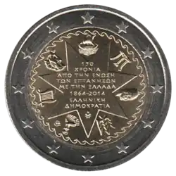Une étoile à sept branches symbolisant la région des sept îles, l'Heptanèse, entourée de sept éléments, symboles de chaque île (depuis le haut, dans le sens des aiguilles d'une montrer) : une trière pour Corfou ; un trépied, symbole sacré d'Apollon, pour Zante ; la tête d'Ulysse pour Ithaque ; le trident de Poséidon pour Paxos ; Vénus pour Cythère ; la lyre d'or d'Apollon pour Leucade et Céphale pour Céphalonie. Dans l'étoile figure la légende 150 ΧΡΟΝΙΑ ΑΠΟ ΤΗΝ ΕΝΩΣΗ ΤΩΝ ΕΠΤΑΝΗΣΩΝ ΜΕ ΤΗΝ ΕΛΛΑΔΑ (150 ans de l'union de l'Heptanèse avec la Grèce), les dates 1864-2014 et la mention du pays émetteur ΕΛΛΗΝΙΚΗ ΔΗΜΟΚΡΑΤΙΑ. Le tout est entouré par une frise hellénique. L'anneau externe de la pièce comporte les douze étoiles du drapeau européen.