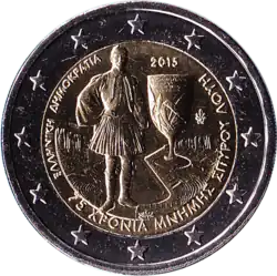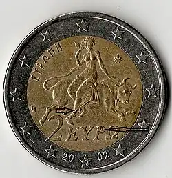• pièce de 2 euros/ευρώ : l'enlèvement d'Europe par Zeus, métamorphosé en taureau, selon une mosaïque de Sparte. En haut à gauche, la légende ΕΥΡΩΠΗ (Europe). En dessous, la valeur nominale en grec, 2 ΕΥΡΩ. Le tout est entouré des 12 étoiles du drapeau européen, entre lesquels est indiqué le millésime en deux parties, sur l'anneau extérieur.