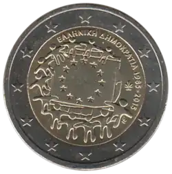 Le drapeau européen dessiné grossièrement, entouré par douze bonshommes stylisés. En haut à droite, le nom du pays émetteur ΕΛΛΗΝΙΚΗ ΔΗΜΟΚΡΑΤΙΑ suivi des années 1985-2015. L'anneau externe de la pièce comporte les douze étoiles du drapeau européen.